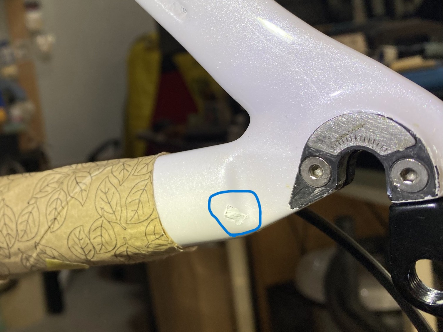 左の画像 青丸部分の塗膜がはがれてカーボン地が見えており、白パテで補修中のものです。