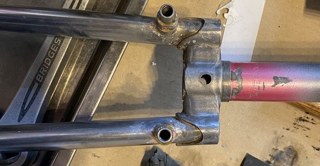 左画像が元の状態 こすりながら乗る前提のようで擦り傷がたくさんありますが、これだけ傷があるのにフォーク自体の大きな凹みはなかったのがさすがBMXのフォークだな、と思います。かなり分厚いパイプで、ずっしりと重いです。